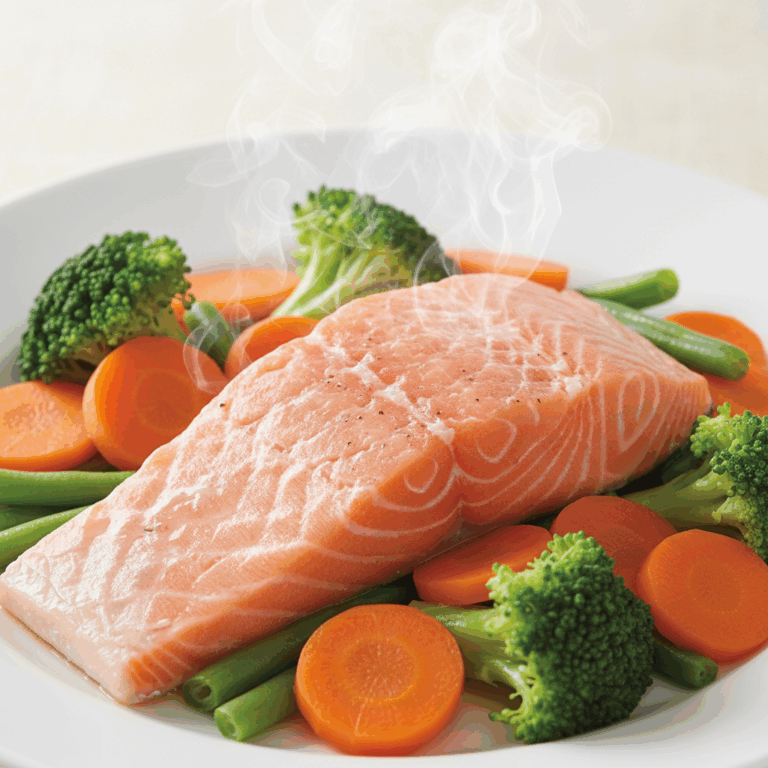 Este método asegura que el salmón se cocine uniformemente, manteniendo su textura suave y jugosa, mientras que los vegetales conservan su color y valor nutricional, perfecto para una dieta saludable.